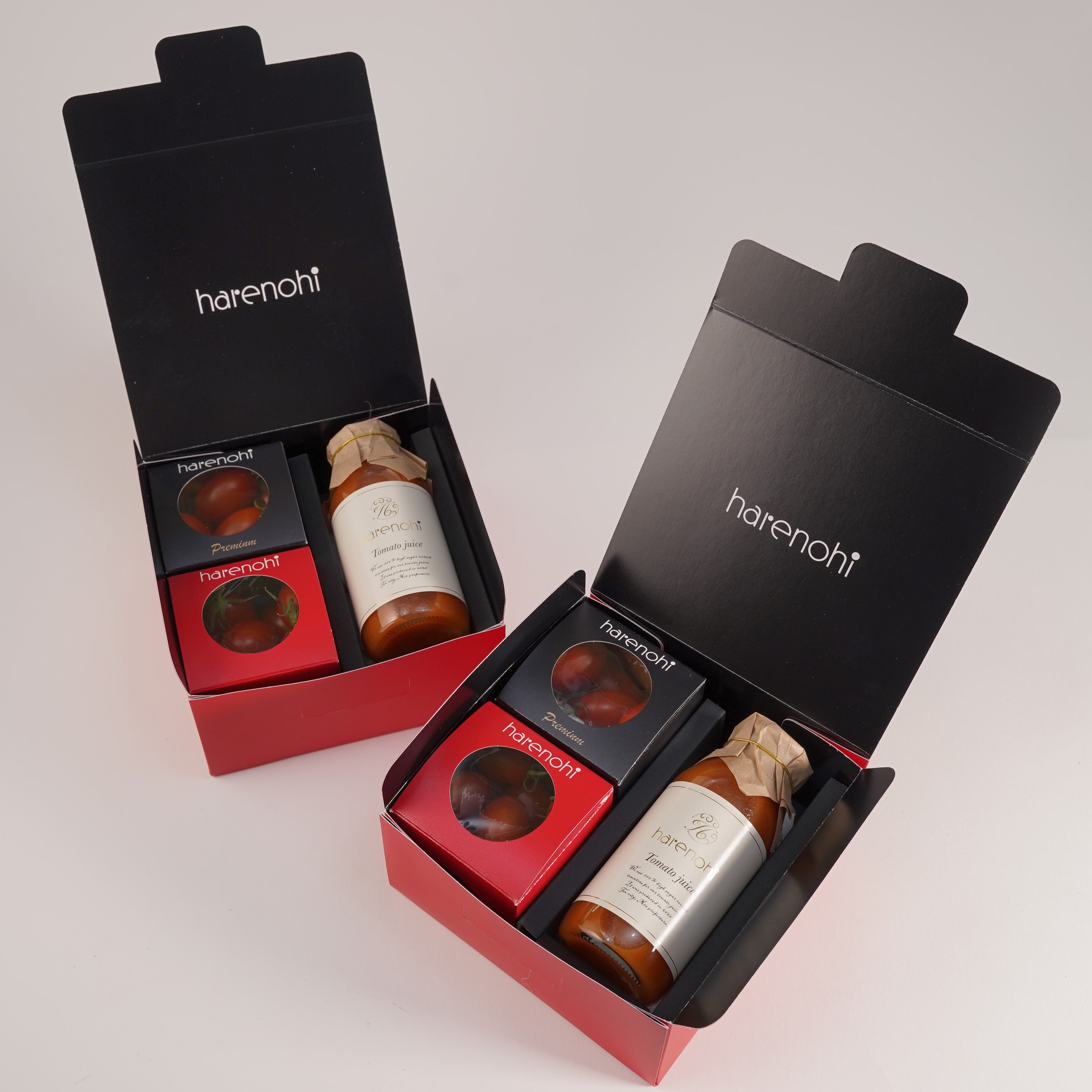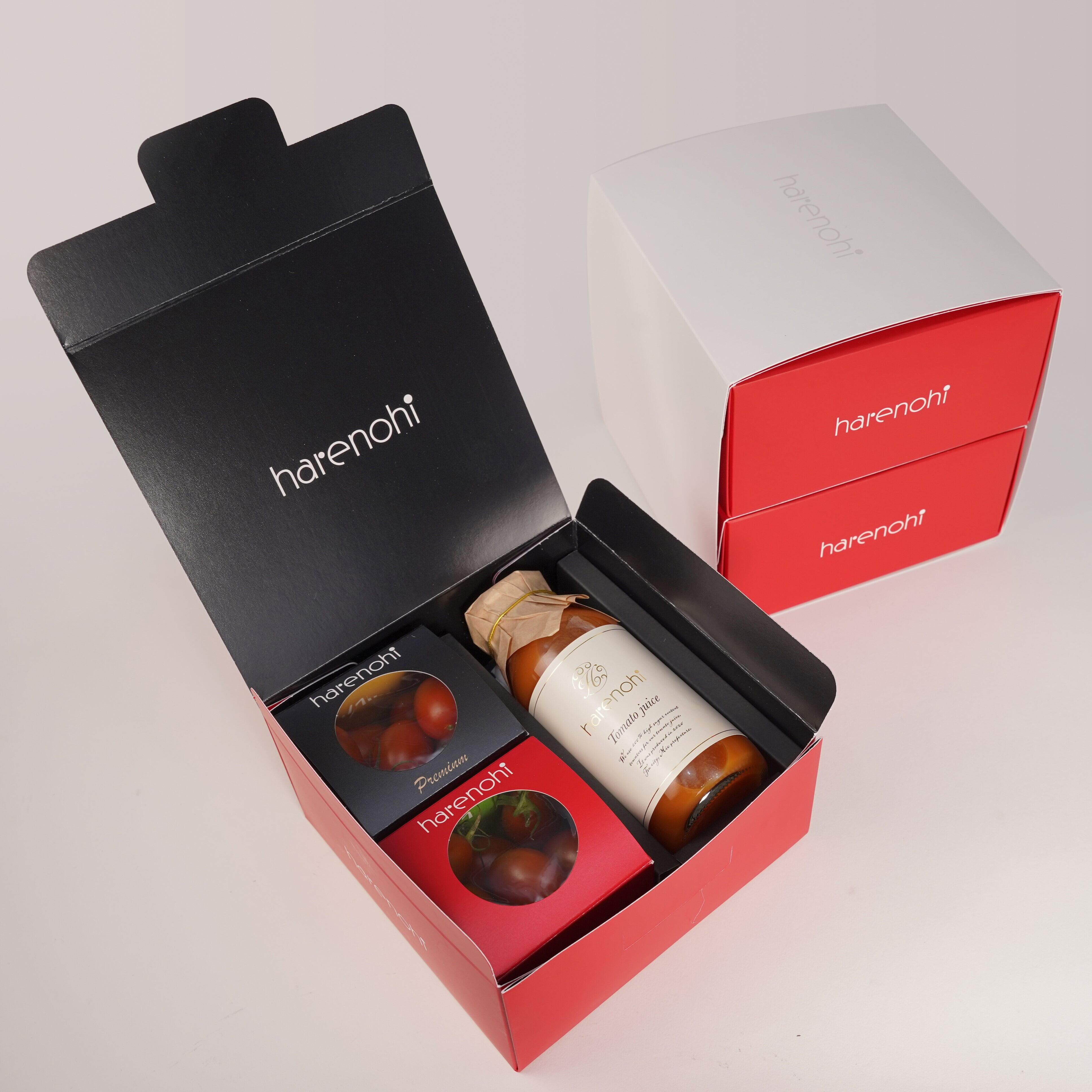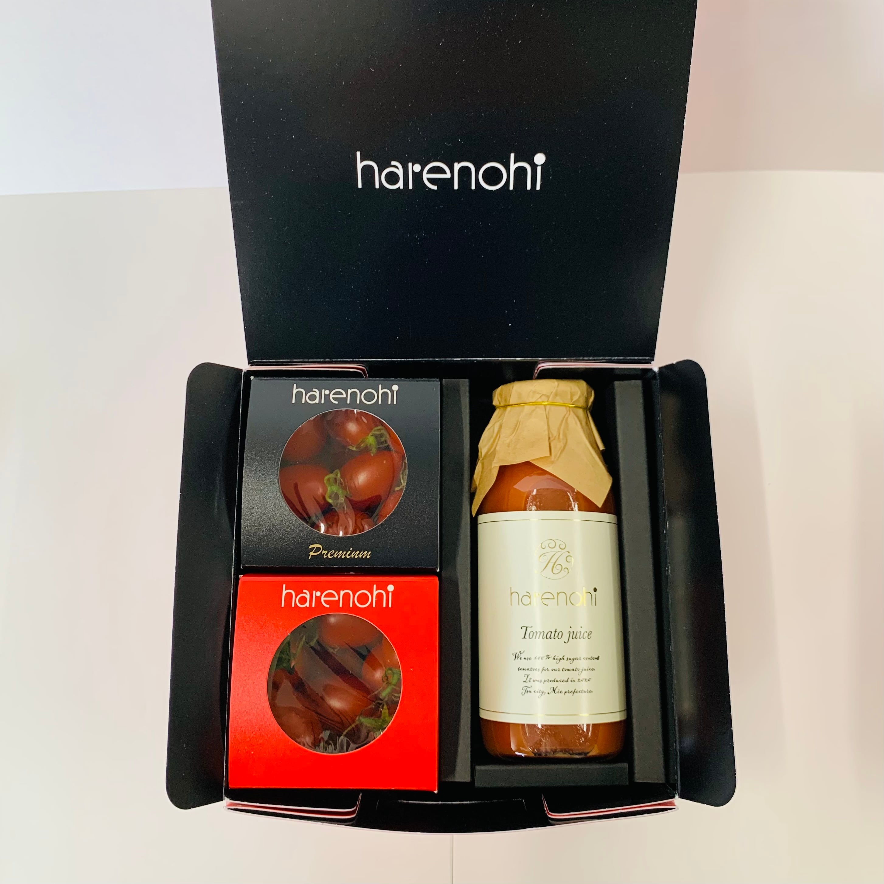「ハレノヒトマト」と「プレミアム」に加えて、トマトジュースも楽しめる食べ比べ&ジュース(170㎖)の2段セット。